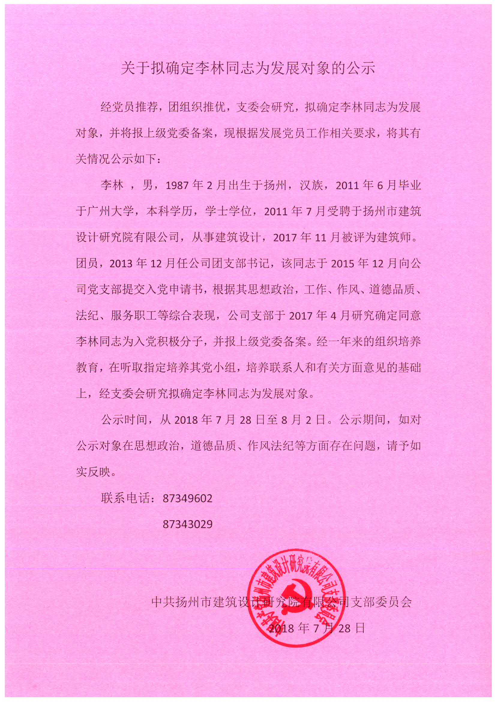 ·關(guān)于擬確定李林同志為發(fā)展對象的公示 [2018-07-28]